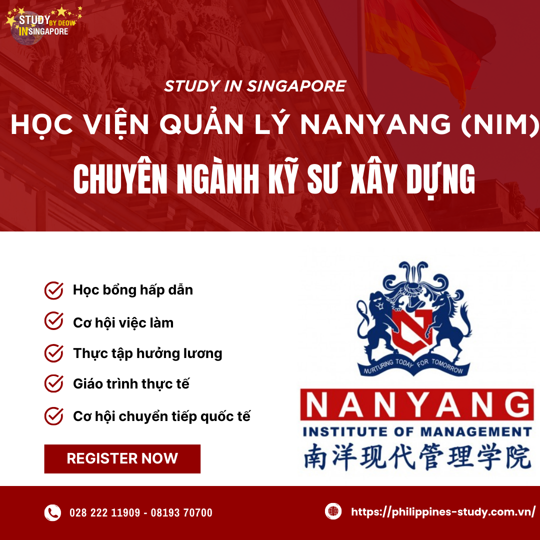 Học viện Quản lý Nanyang Singapore (NIM) là một trong những học viện nổi bật với việc đào tạo ngành kỹ sư xây dựng tại Singapore. Giáo trình giảng dạy mang tính thực hành cao cùng chính sách thực tập hưởng lương đã mang đến cho sinh viên quốc tế nhiều cơ hội tiếp cận với ngành nghề kỹ sư tại Singapore – đất nước phát triển mạnh mẽ về hạ tầng.