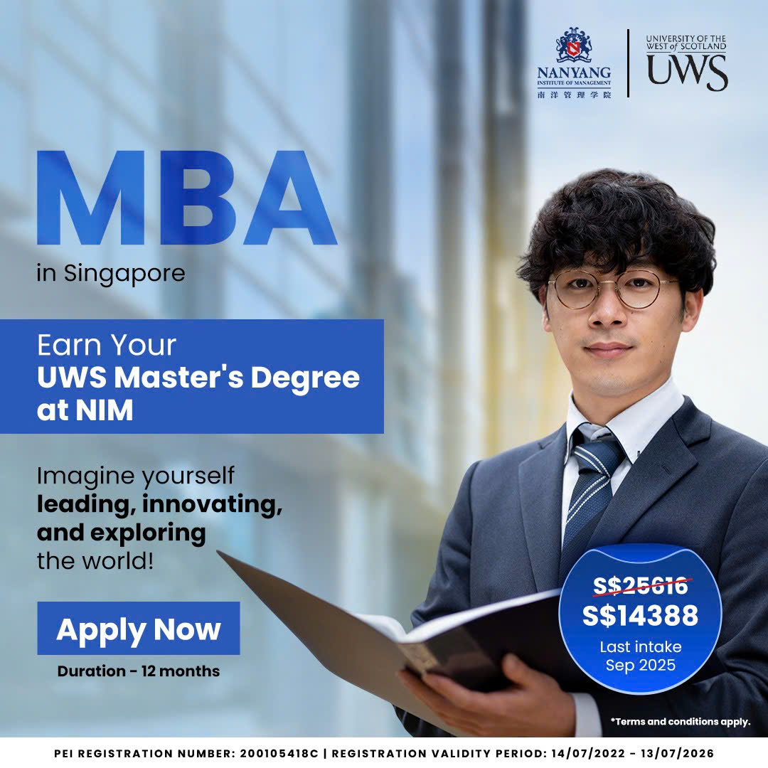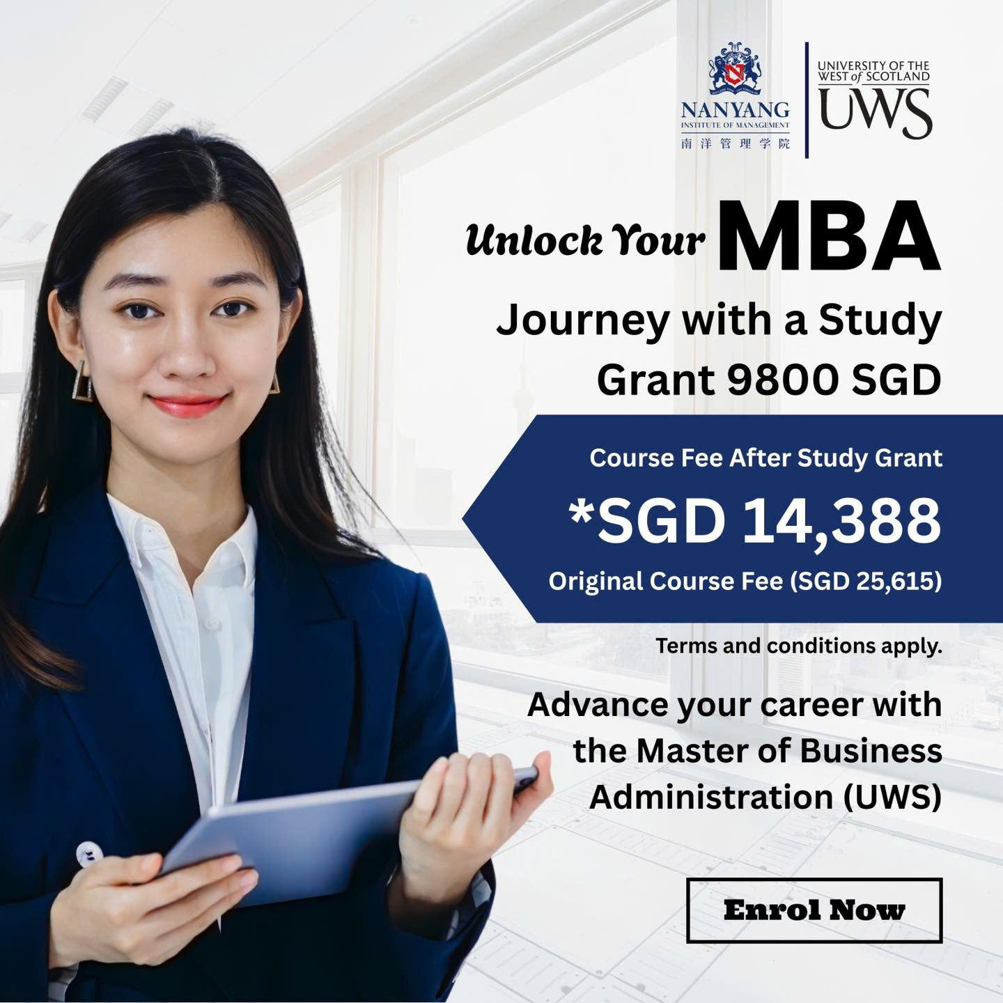 Nếu bạn đang tìm kiếm một chương trình MBA quốc tế chất lượng cao nhưng với mức chi phí tối ưu thì hãy đến ngay với Học viện Quản Lý Nanyang – Singapore. Khóa học với giáo trình giảng dạy chất lượng cao sẽ giúp sinh viên nâng cao kiến thức kinh doanh. Chương trình học được Nanyang liên kết với Đại học West of Scotland (UWS – UK) chính là nơi lý tưởng để sinh viên theo học chương trình MBA tại châu Á.