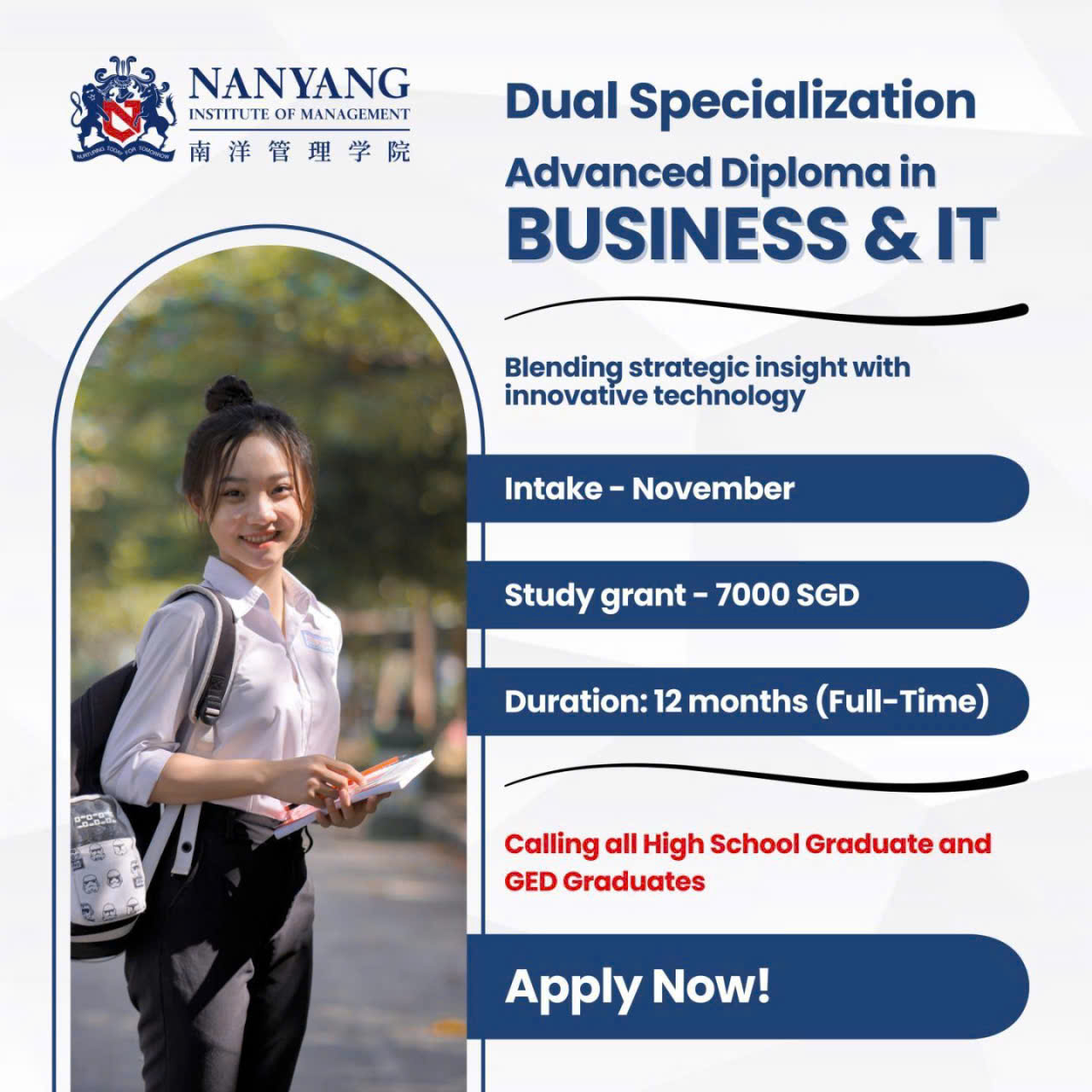 - 🎉 Chương Trình Advanced Diploma In Business & IT – Khóa Học Song Ngành Chuyên Ngành Kinh Doanh & Công Nghệ Thông Tin - Học Bổng Lên Đến 7,000SGD 🎉