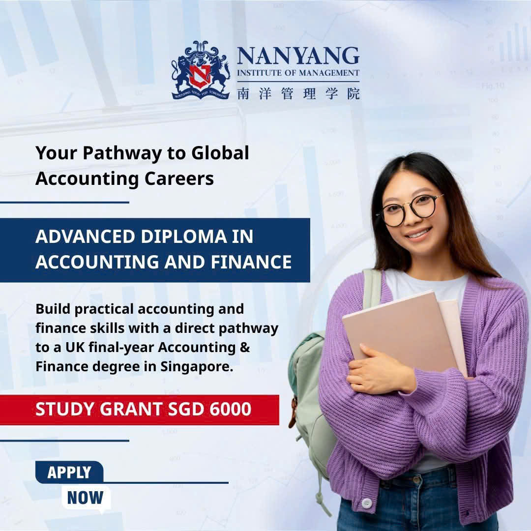 🎓 Chương trình Cao đẳng Nâng cao về Kế toán & Tài chính tại Học viện Quản lý Nanyang được thiết kế dành riêng cho những bạn muốn theo đuổi một lộ trình học thực tế, chuẩn quốc tế, và có định hướng phát triển sự nghiệp lâu dài tại Singapore hoặc các quốc gia khác.