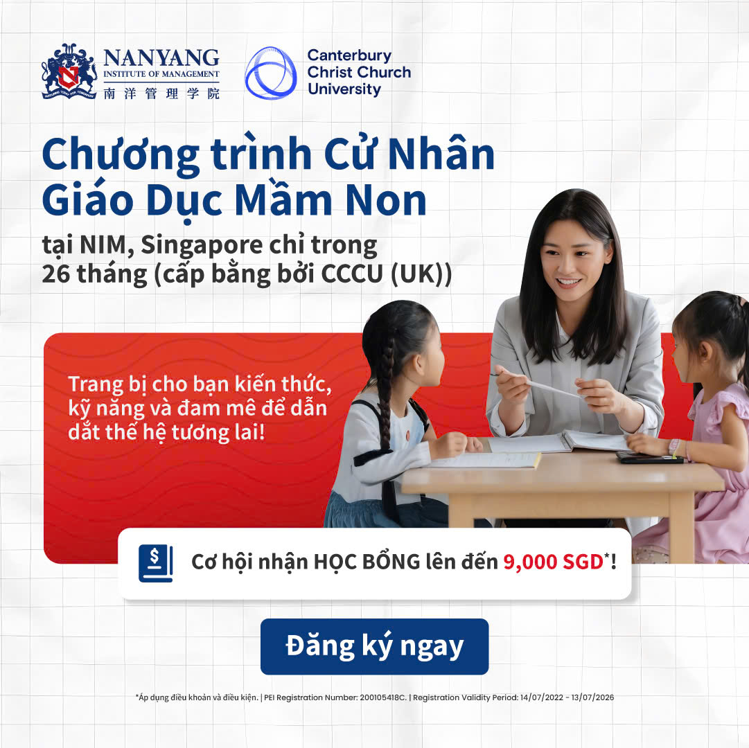 Tại Học Viện Quản Lý Nanyang (NIM – Singapore), sinh viên sẽ được tiếp cận chương trình Cử Nhân Giáo Dục Mầm Non hiện đại với giáo trình được cập nhật liên tục, kết hợp giữa lý thuyết và thực tiễn. Sinh viên sẽ được phát triển các năng lực chuyên môn và kỹ năng kiểm soát cảm xúc trong môi trường giáo dục quốc tế. Sinh viên đến với NIM không chỉ được học kiến thức mà còn được truyền cảm hứng trong việc đào tạo giáo dục. Đối với NIM, việc trở thành người truyền cảm hứng cho thế hệ đầu đời không chỉ là một nghề, mà đó là cả một sứ mệnh cao cả. Sau khi tốt nghiệp sinh viên sẽ nhận được bằng do Đại học Canterbury Christ Church (UK) cấp. Đầu tư cho việc học 26 tháng bạn sẽ có cả tương lai rực rỡ phía trước.
