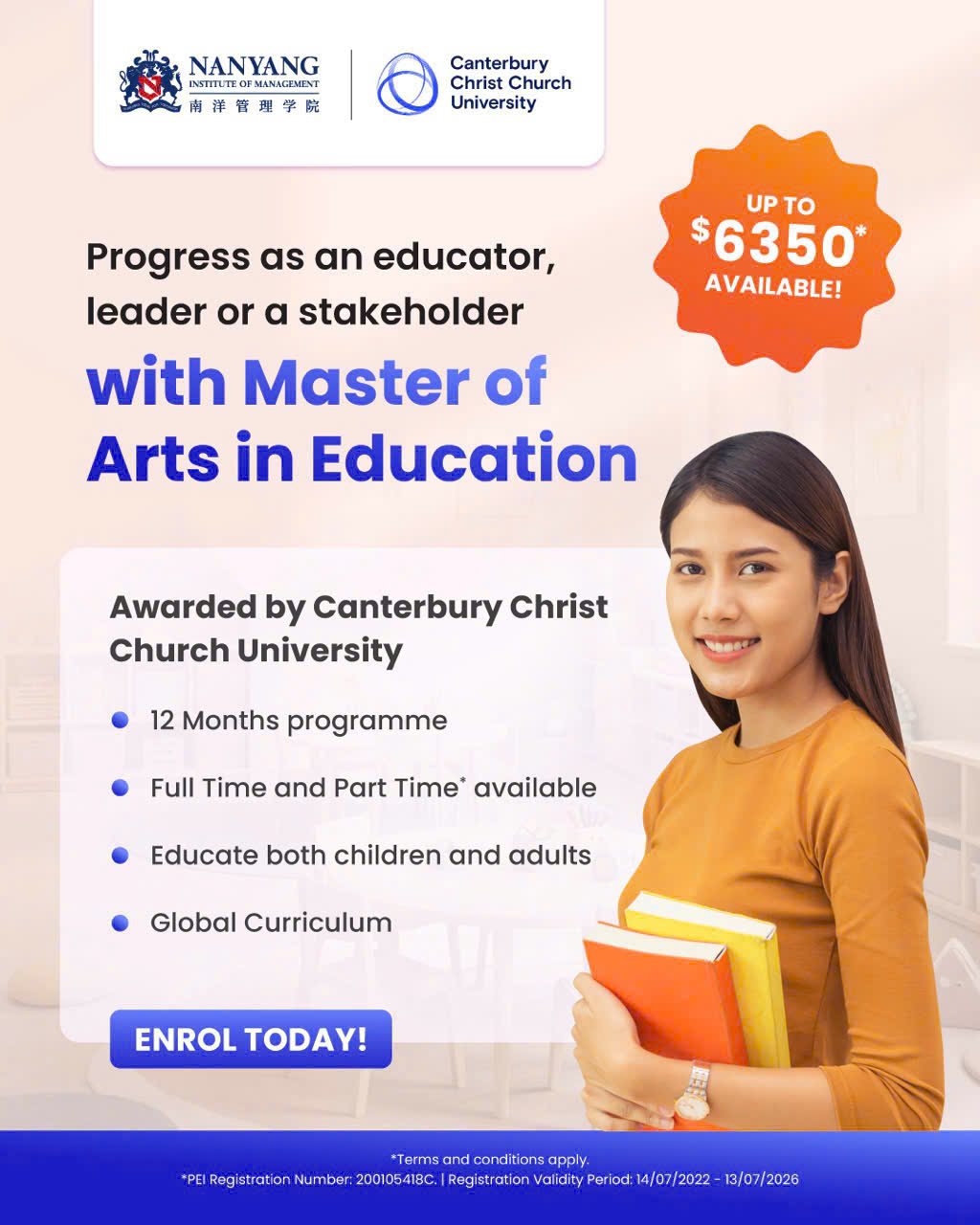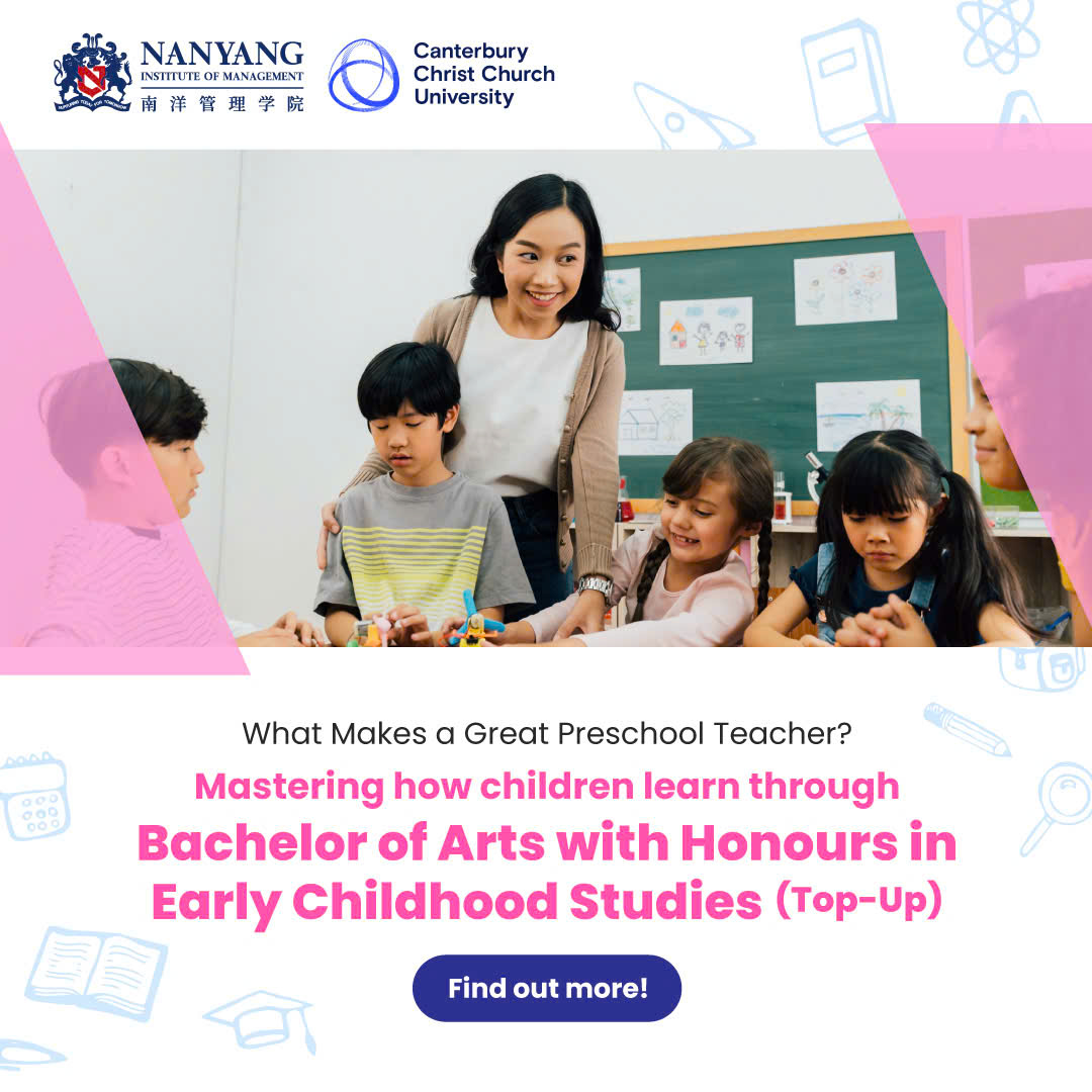 Hãy nắm bắt cơ hội để nâng cao chuyên môn của mình với chương trình Cử nhân Nghệ thuật (Danh Dự) ngành Nghiên cứu Giáo dục Mầm Non (Top-Up) – một chương trình liên kết giữa Học viện Quản lý Nanyang (Singapore) và Canterbury Christ Church University (UK).