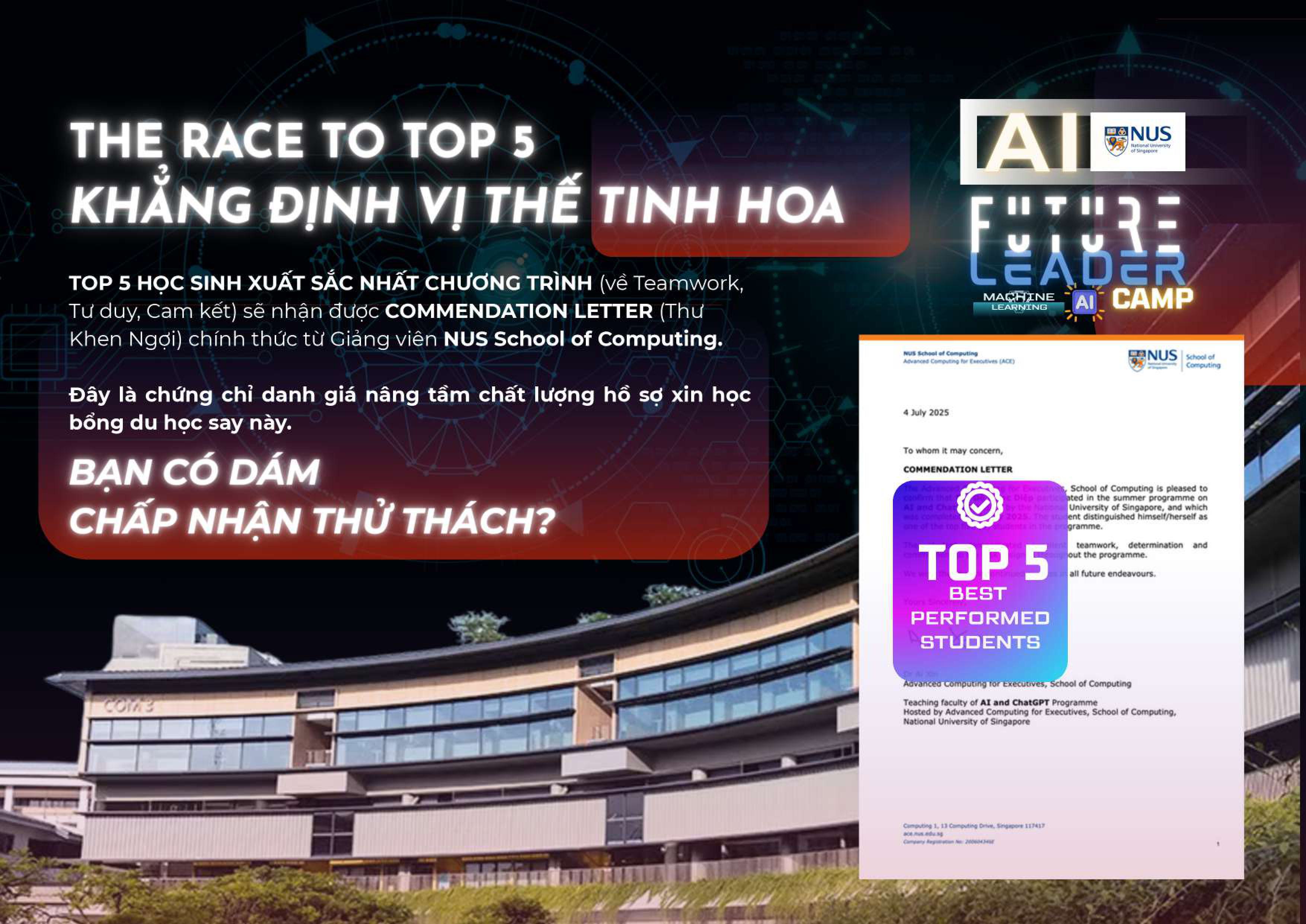 Đại học Quốc Gia Singapore (NUS) – Trường Đại học Top 8 Thế Giới, Top 1 Châu Á chính thức đem đến chương trình học tập độc quyền về AI cho các em học sinh tham dự trại hè quốc tế Johor Singapore. Đây là chương trình trại hè đặc biệt về công nghệ được tổ chức thiết kế bởi nơi được mệnh danh là thánh đường học thuật công nghệ châu Á – NUS SINGAPORE, dành cho những học sinh tinh hoa nhất. Top 5 học viên xuất sắc nhất sẽ nhận LETTER OF COMMENDATION từ NUS để nâng tầm hồ sơ du học tương lai.