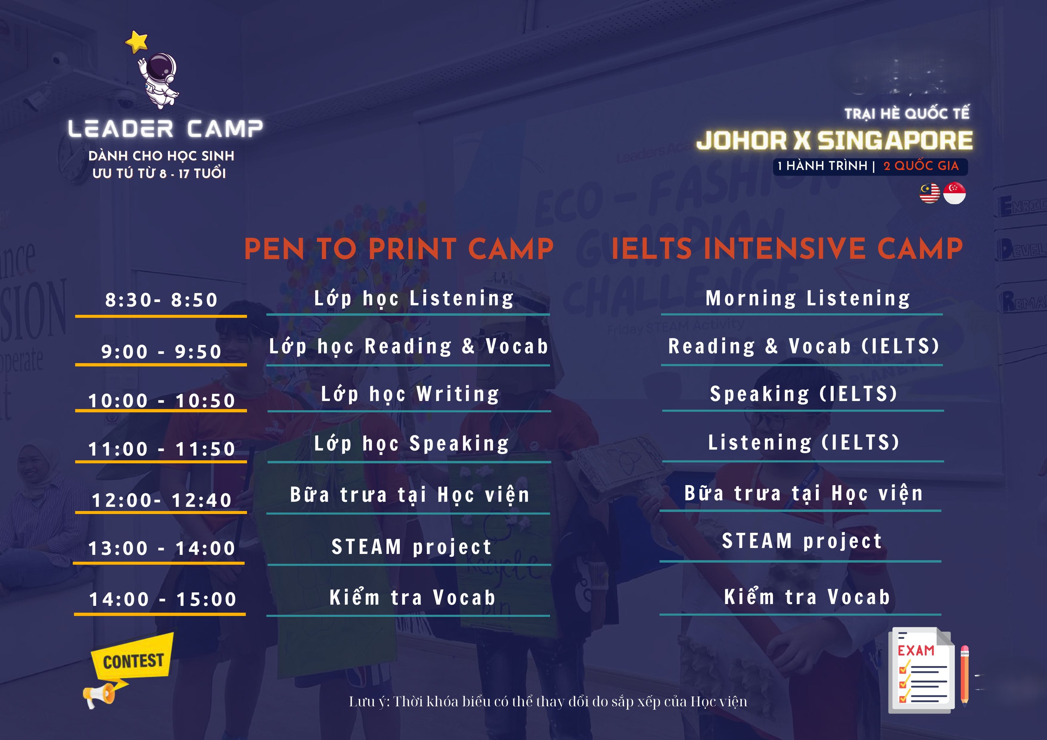 Chương trình học tập trong trại hè Johor - Singapore 2026 được thiết kế bởi LEADERS ACADEMY, một trong những đơn vị giảng dạy uy tín về Tiếng Anh, kỹ năng lãnh đạo, kỹ năng mềm tốt nhất tại Johor Bahru với thời lượng lên đến gần 6 giờ học/ngày, từ thứ 2 đến thứ 6. Chương trình 2026 có 02 lựa chọn cho học sinh: Pen to Print Camp & IELTS Intensive Camp.