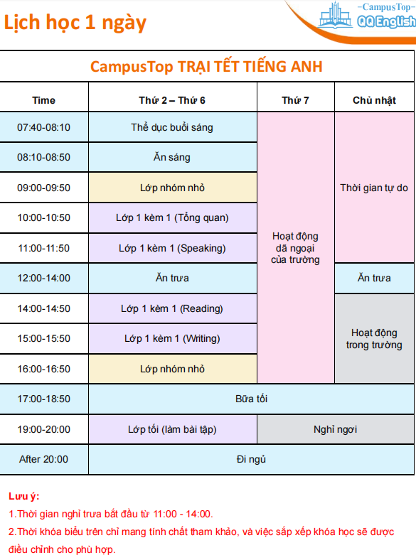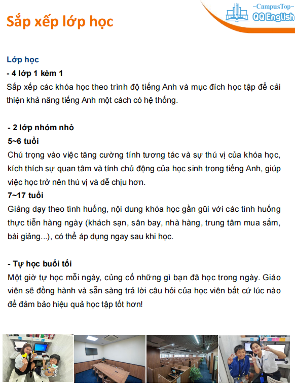 | Khóa học | Mỗi ngày: 4 lớp 1 kèm 1, 2 lớp nhóm |