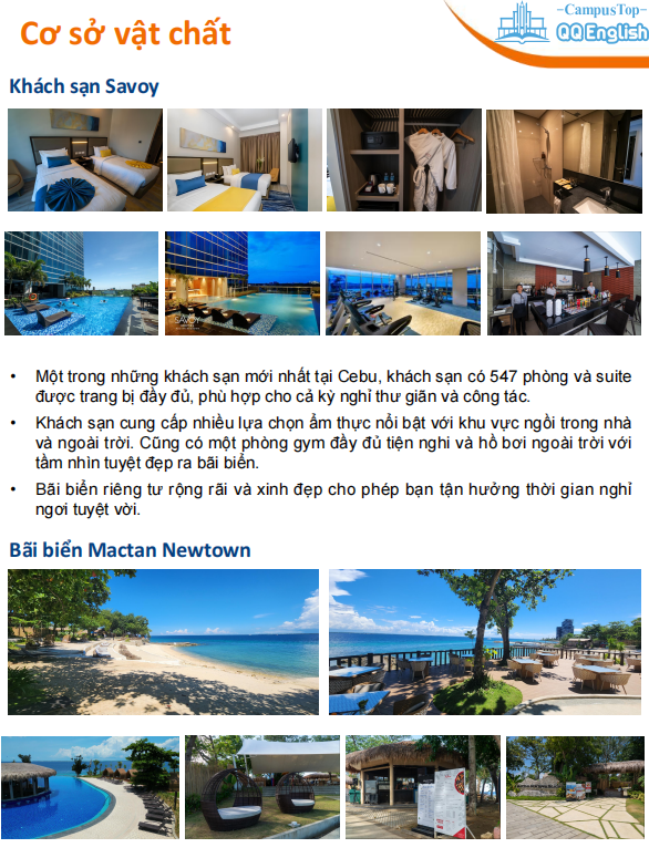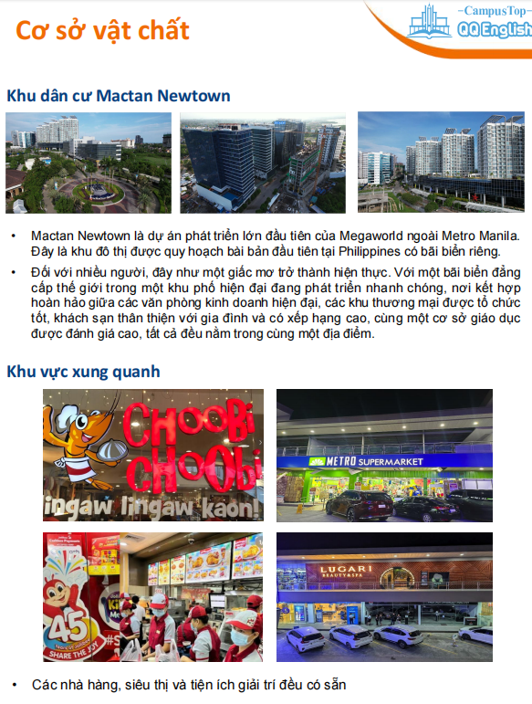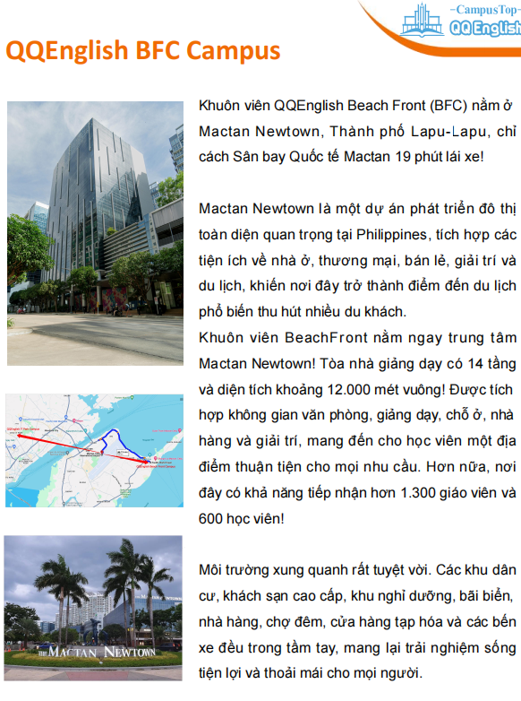 Mactan Newtown là một dự án phát triển đô thị toàn diện đóng vai trò quan trọng của Philippines, tổ hợp dân cư, thương mại, siêu thị, giải trí và du lịch, khiến nơi đây trở thành điểm đến nghỉ dưỡng nổi tiếng thu hút nhiều khách du lịch. Cơ sở Beach Front nằm ở trung tâm Mactan Newtown! Tòa nhà gồm 14 tầng và rộng khoảng 12.000 mét vuông! Được tích hợp văn phòng, lớp học, kí túc xá, nhà ăn và không gian giải trí, trở thành nơi lý tưởng đáp ứng mọi nhu cầu của học viên. Sức chứa lên tới hơn 1000 giáo viên và 600 học sinh!