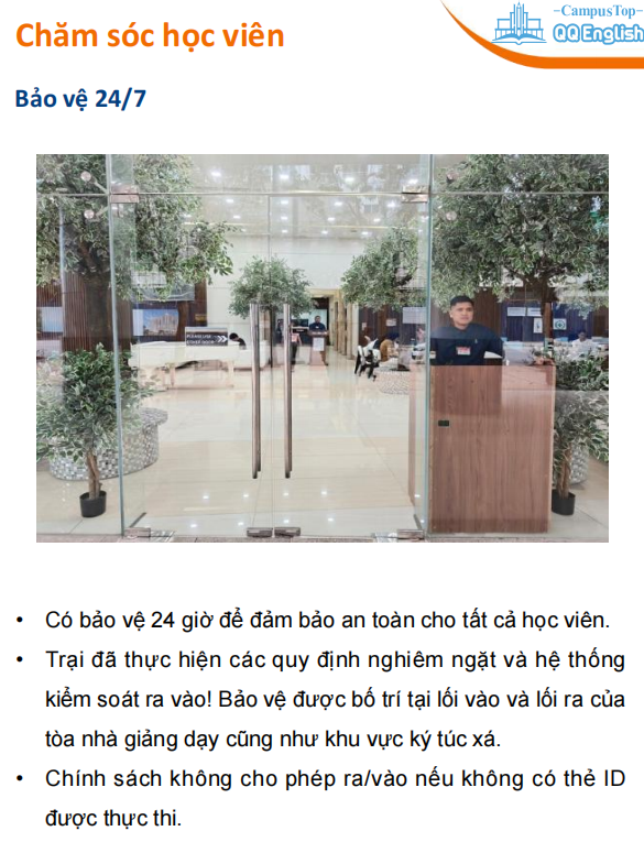 -Ứng dụng độc quyền giám sát lớp học trực tiếp, ba mẹ cũng có thể theo dõi tình hình lớp học của con trực tiếp dù đang ở nhà. -Khuân viên ven biển an toàn và thuận tiện, kết nối tổng