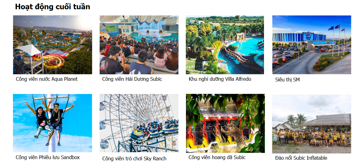 Cuối tuần, học viên sẽ có những chuyến đi trải nghiệm văn hóa tại các địa điểm vui chơi, du lịch trong phạm vi Clark để thư giãn và tái tạo năng lượng cho tuần học tiếp theo.