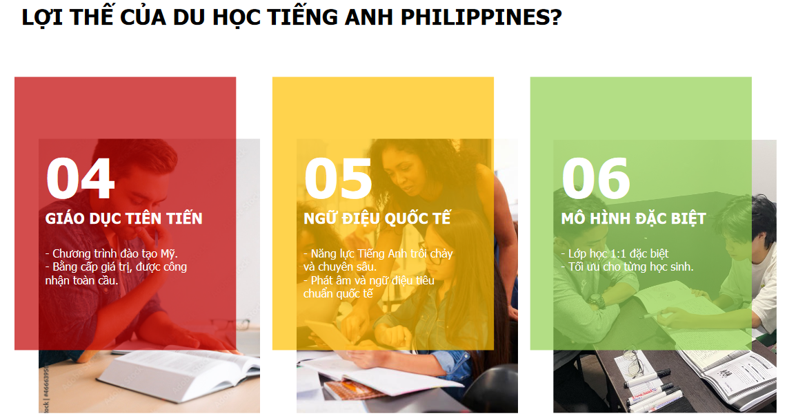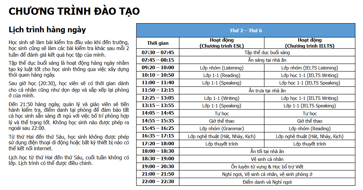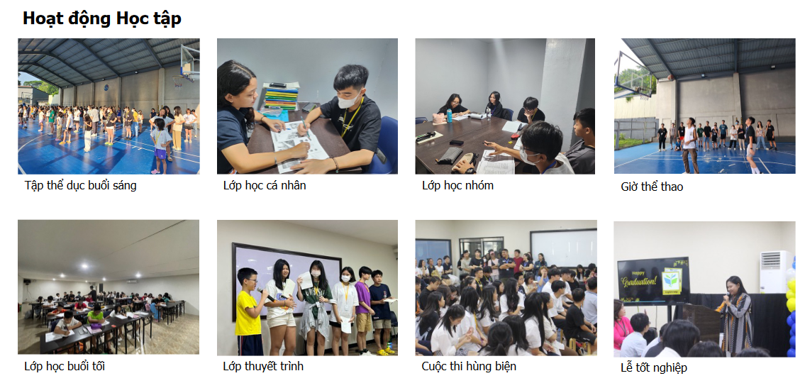 Hàng ngày, học viên sẽ có 4 lớp học 1:1 cho 4 kỹ năng chính (Nghe, Nói, Đọc, Viết) và 2 lớp học nhóm nhỏ (Pronunciation và Group Speaking) để nâng cao kỹ năng phát âm và rèn luyện kỹ năng Tiếng Anh đã học dựa trên các hoạt động trong lớp. Bên cạnh đó, học viên có thêm các hoạt động nhóm lớn: Chơi thể thao, Học hát – nhảy, Thuyết trình, Các trò chơi tập thể… Buổi tối các ngày trong tuần, học viên có lớp buổi tối (có hỗ trợ từ giáo viên) để tăng cường, bổ trợ thêm kiến thức. Cuối mỗi tuần, trường sẽ tổ chức cho học viên các hoạt động ngoài trời: Thăm quan công viên hải dương, Vui chơi tại công viên nước, Khám phá vườn bách thú… để giải trí và có những trải nghiệm quốc tế tại Philippines.