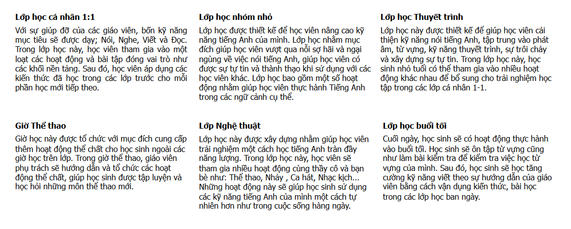 Chương trình học đa dạng, chuyên sâu (10-11 lớp học/ngày) với các hoạt động nhằm khuyến khích sự tự tin trong giao tiếp bằng tiếng Anh (Cuộc thi diễn thuyết, kể chuyện, chương trình âm nhạc, nhập vai làm MC dẫn chương trình, viết luận, …). Học viên được trải nhiệm đa dạng các hoạt động nhằm tạo hứng thú trong các lớp học tiếng Anh (các lớp học ghi-ta, các hoạt động nghệ thuật, âm nhạc và cả thể chất,…)
