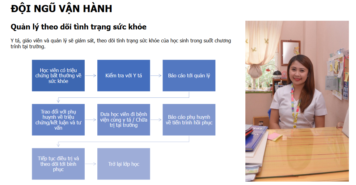 - Bệnh viện: Nếu một học sinh bị ốm, trong trường hợp cần thiết, sau khi có ý kiến từ các y tá của trường, sẽ được đưa đến bệnh viện cùng với giáo viên của mình.
