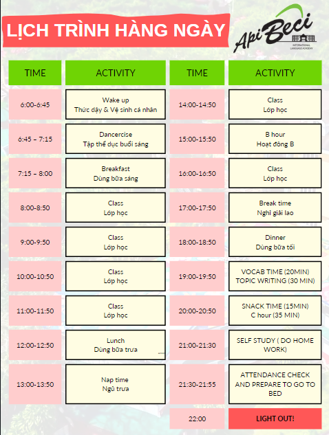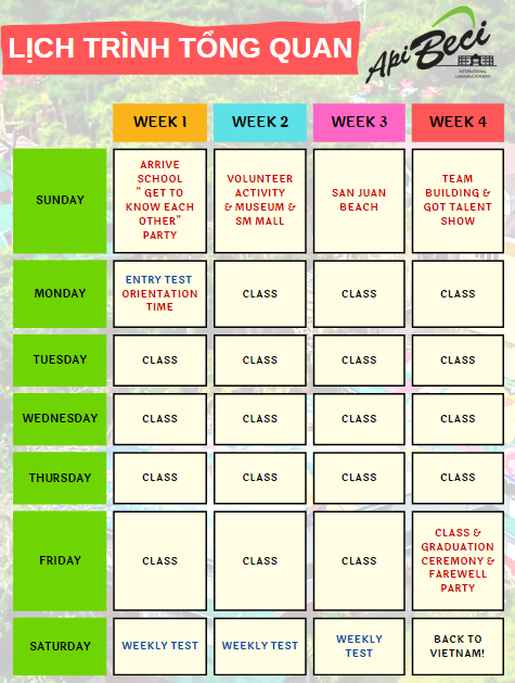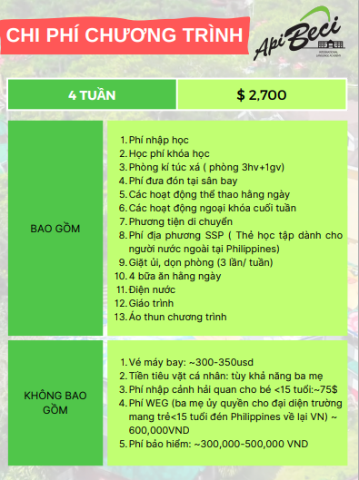 Chương trình được thiết kế tối ưu việc Học tập tiếng Anh và Trải nghiệm ngoại khóa tại Philippines trong 4 tuần hè (Tháng 6- Tháng 7) với mục tiêu đem lại môi trường 100% tiếng Anh cho các bạn thanh thiếu niên Việt. Vậy, chương trình học tại trại hè BECI có gì hay?