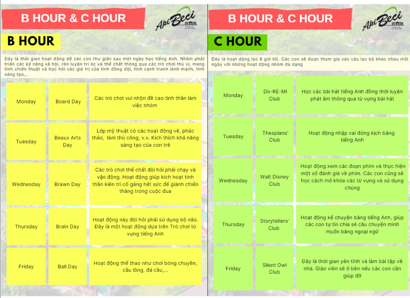TRẠI HÈ BECI 2025 cung cấp 2 khóa học. Cả 2 đều cung cấp 4 lớp học 1:1, 2 lớp học nhóm và 2 lớp tối.