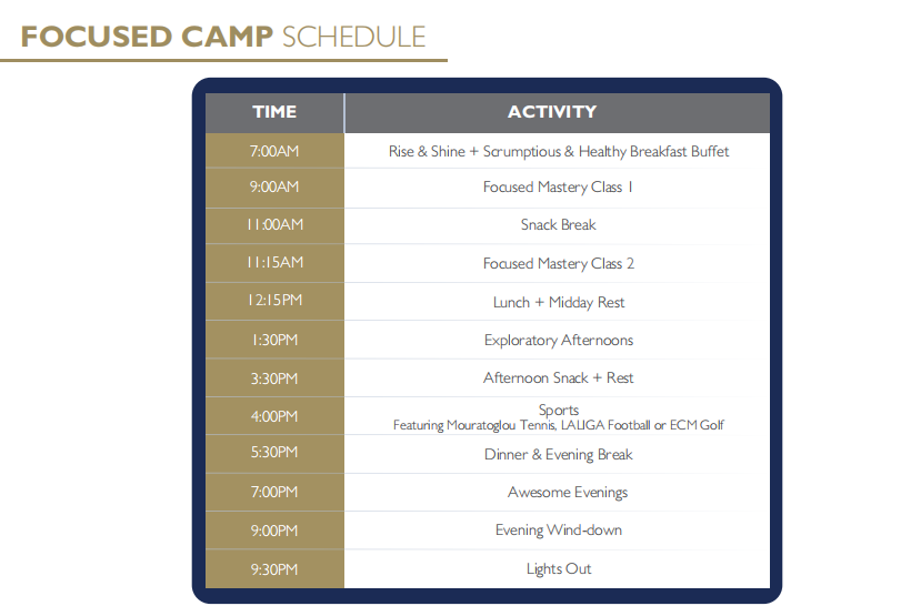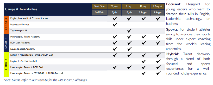Hãy xem biểu đồ trại hè của chúng tôi bên dưới để biết ngày và thông tin chi tiết, bao gồm các lựa chọn kết hợp giữa học thuật và thể thao. Khám phá