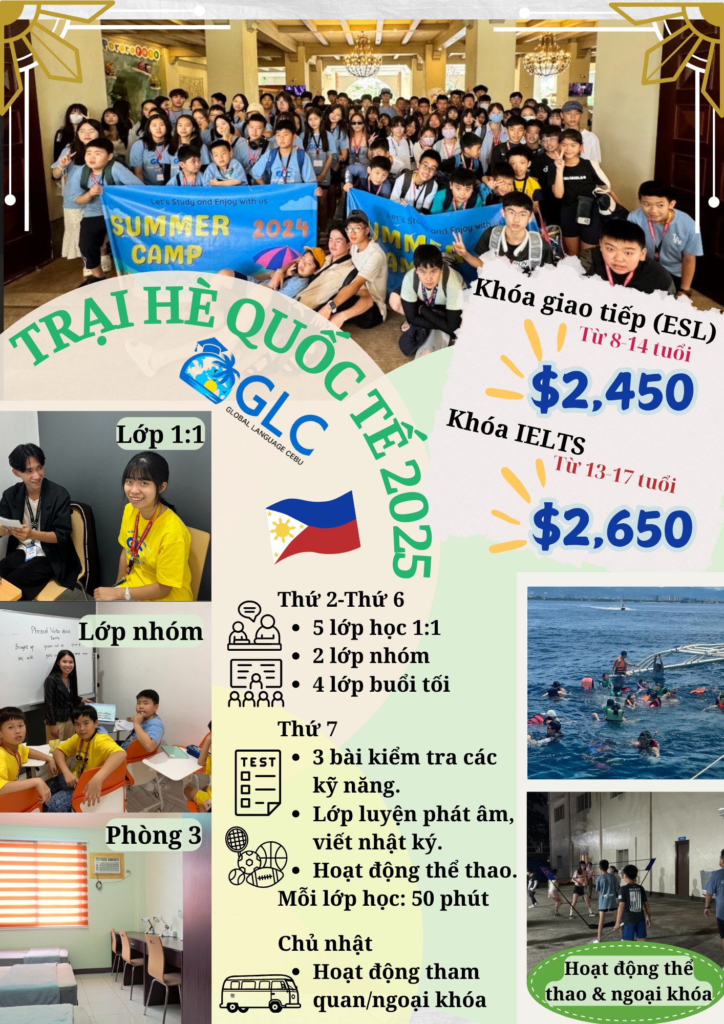Hàng năm, GLC tổ chức chương trình " TRẠI HÈ GLC 2025" với phương châm giúp các con tận hưởng mùa hè thoải mái, khám phá đất nước Philippines xinh đẹp thú vị mà vẫn cải thiện và nâng cao kỹ năng tiếng Anh, làm quen với bài thi IELTS – một hệ thống bài kiểm tra về khả năng sử dụng thành thạo tiếng Anh trải dài qua cả bốn kĩ năng Nghe, Nói, Đọc, Viết.