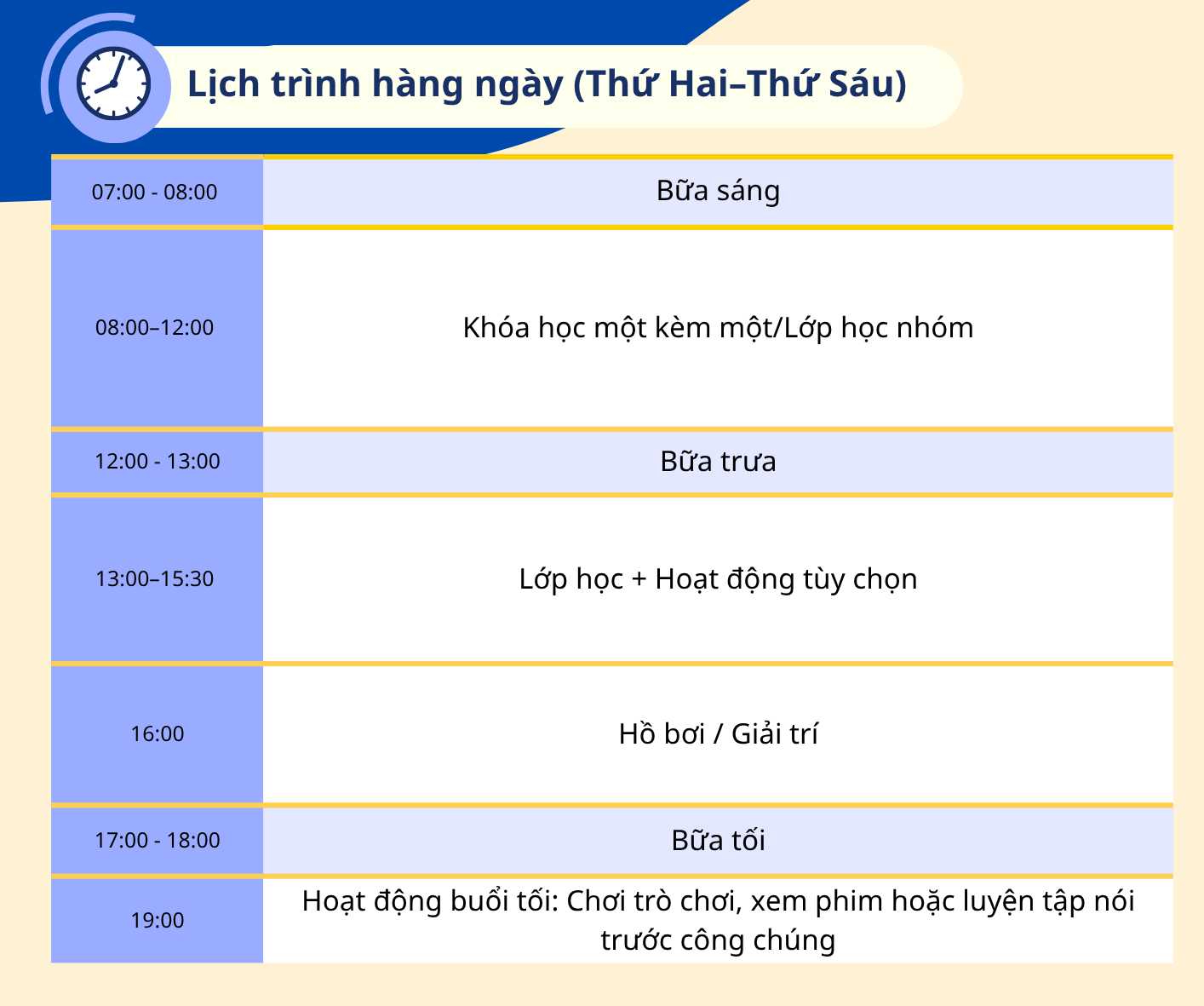 Được thiết kế đặc biệt cho học sinh Việt Nam từ 6 đến 18 tuổi, trại hè kết hợp chương trình học tiếng Anh chuyên sâu, hoạt động ngoài trời hấp dẫn và môi trường an toàn, thân thiện cùng bạn bè quốc tế.