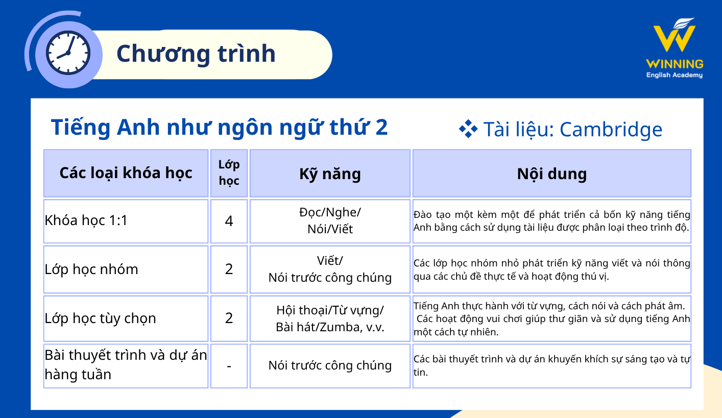 Winning tập trung vào mô hình học tập tương tác cao phù hợp với mọi cấp độ từ cơ bản đến nâng cao. Một số phương pháp mà chúng tôi đang áp dụng như sách tranh trẻ em, lớp học kết hợp trò chơi, lớp học STEAM…Ngoài ra, trường còn áp dụng EOP (Chỉ tiếng Anh) để tối đa hóa việc học