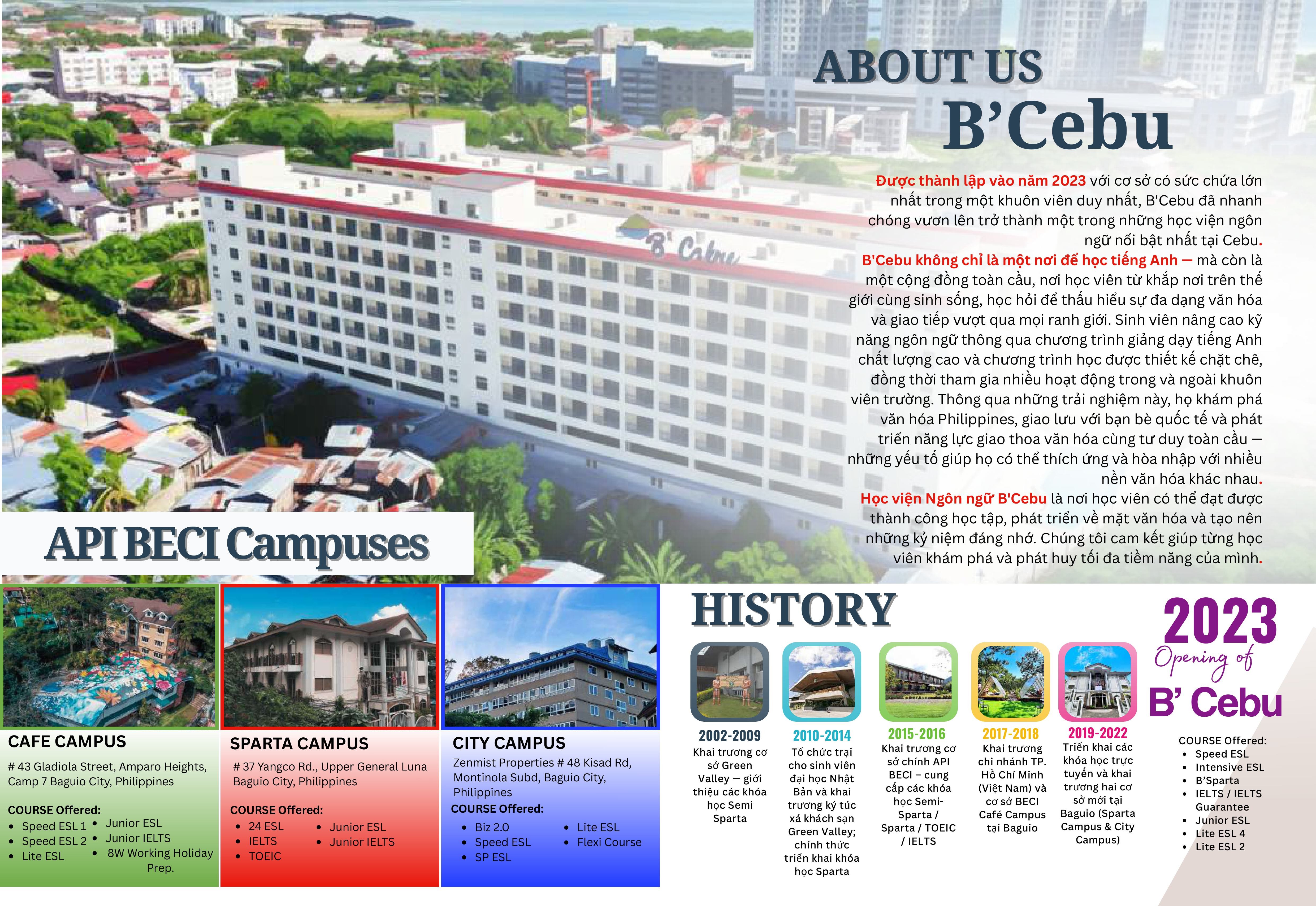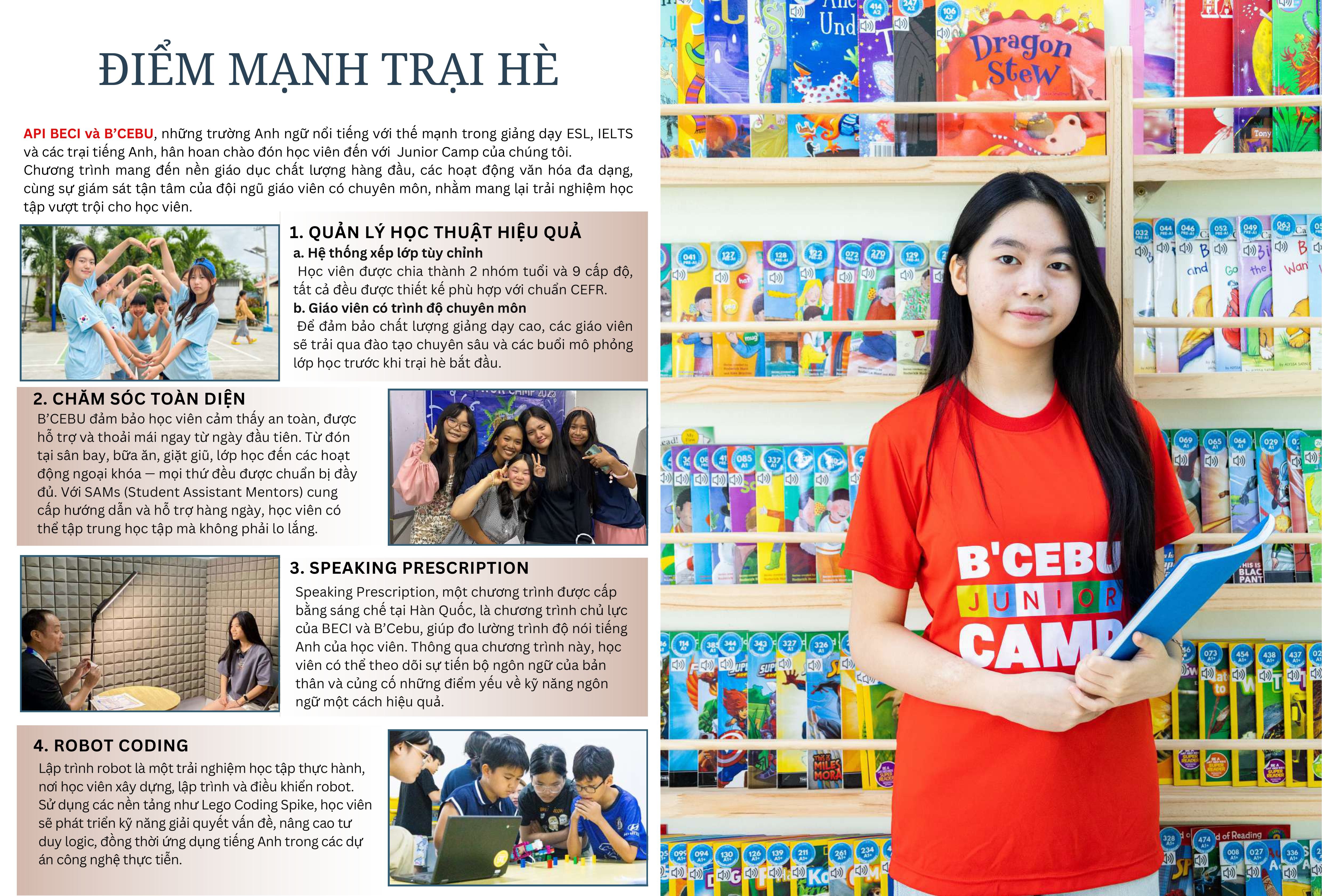 Trường Anh ngữ API BECI là một trong những trường Anh ngữ chất lượng và nhiều chi nhánh nhất Philippines. Năm 2026 này, API BECI cho ra mắt Trại hè Anh ngữ B'CEBU nhằm đem đến cho học viên một không gian học tập kết hợp vui chơi lành mạnh đem lại hiểu quả cao. Trại hè Anh ngữ sẽ giúp các em tiếp xúc với nền giáo dục quốc tế và giao lưu với học viên từ nhiều quốc gia trên thế giới nhằm tạo nên sự tự tin, đánh thức tiềm năng nơi con trẻ.