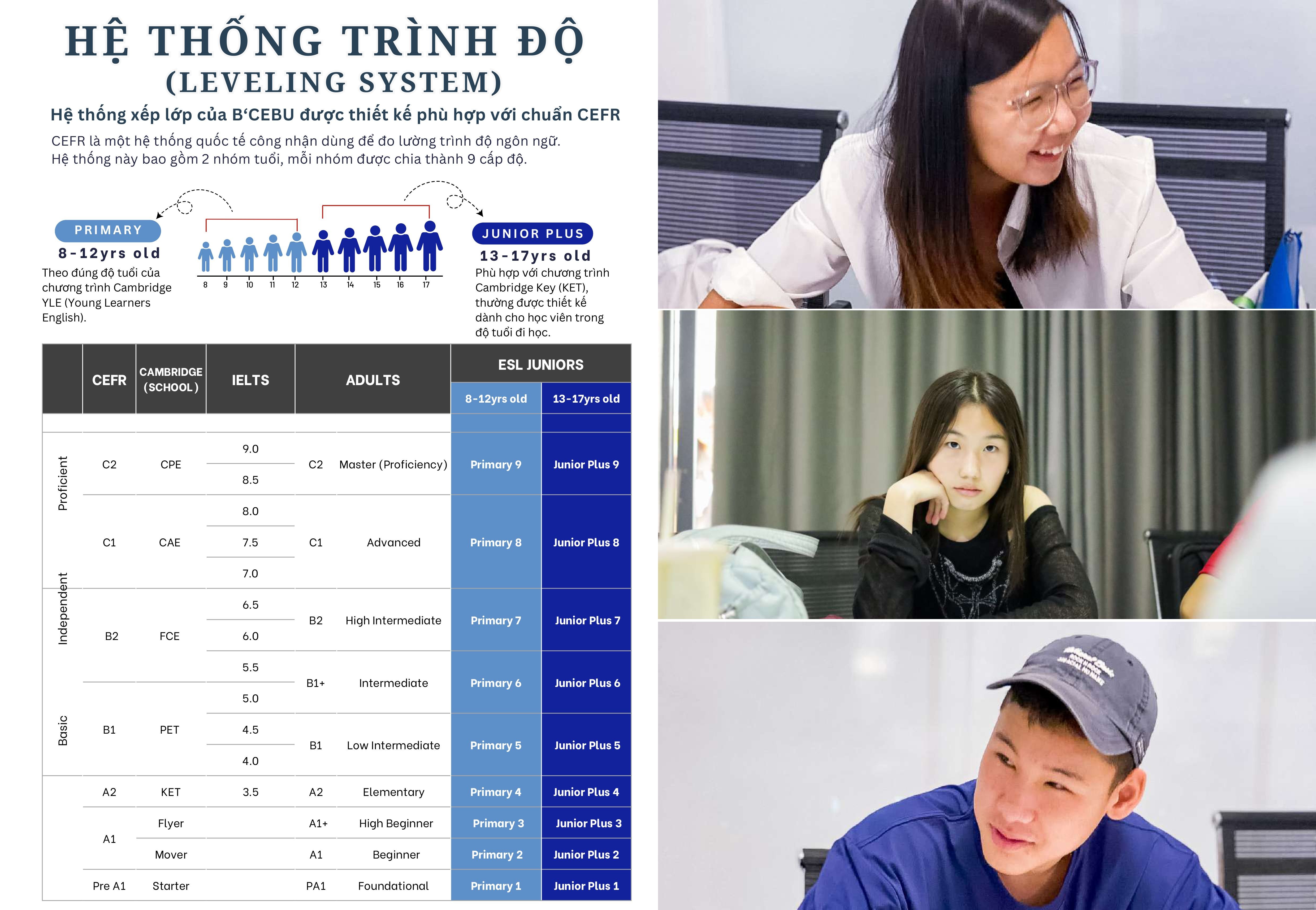 Xếp lớp tùy chỉnh: 2 nhóm tuổi, 9 cấp độ CEFR giúp tối ưu hiệu quả học tập.