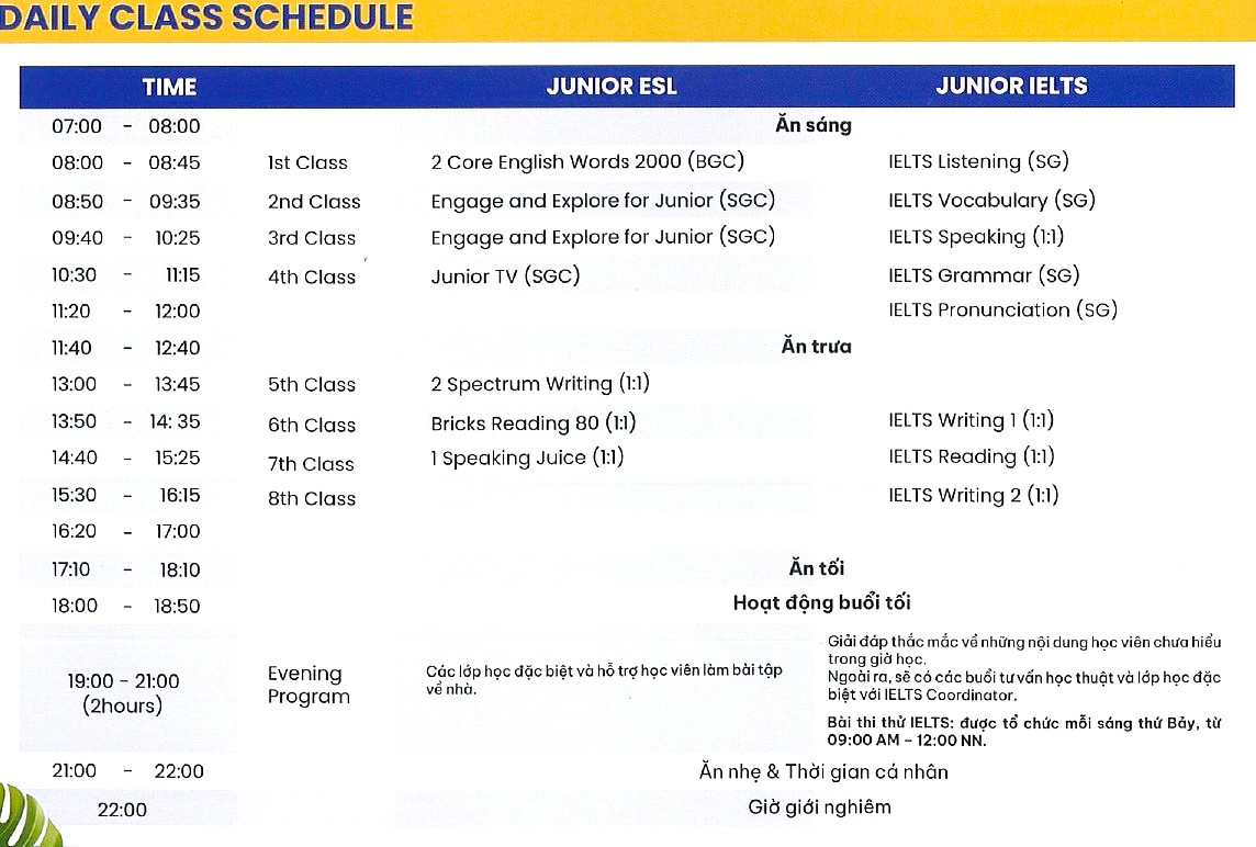 Khóa học JUNIOR ESL dành cho học viên có trình độ tiếng Anh mới bắt đầu, chương trình chú trọng nhiều vào phát âm, ngữ điệu và phản xạ nói. Học viên được Giáo Viên Chủ nhiệm (Buddy teacher) KIỂM TRA NHẬT KÝ TIẾNG ANH VÀ BÀI TẬP VỀ NHÀ MỖI NGÀY. Ngoài ra còn được tư vấn cả về định hướng học tập cũng như cuộc sống hàng ngày, nhờ vậy học viên sẽ nhanh chóng thích nghi và cảm thấy thích thú với tiếng Anh. Học sinh phải học và sử dụng từ 20 đến 50 từ mới mỗi ngày, số lượng từ vựng có thể thay đổi tùy theo trình độ của học viên.