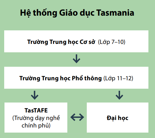 Hệ thống trường công lập bang Tasmania có cấu trúc độc đáo. Học sinh học trường Trung học Cơ sở từ lớp 7 đến lớp 10, sau đó học lên trường Trung học Phổ thông từ lớp 11 và 12. Sự tách biệt giữa hai cấp trung học này cho phép học sinh lớp 11 và 12 hoàn thành chương trình giáo dục ở môi trường được thiết kế chuyên biệt để chuẩn bị cho việc học đại học, học nghề, hoặc đi làm việc sau này. Học sinh được xem như người trưởng thành và được dạy các kỹ năng quan trọng để hỗ trợ tương lai, chẳng hạn như sự tự lập và khả năng tự quản lý việc học của mình. Là một sinh viên quốc tế, bạn có thể theo học ở bất kỳ cấp học nào. Tuy nhiên, nếu bạn dưới 12 tuổi, thì ba mẹ hoặc người giám hộ sẽ phải đến Tasmania ở cùng bạn.