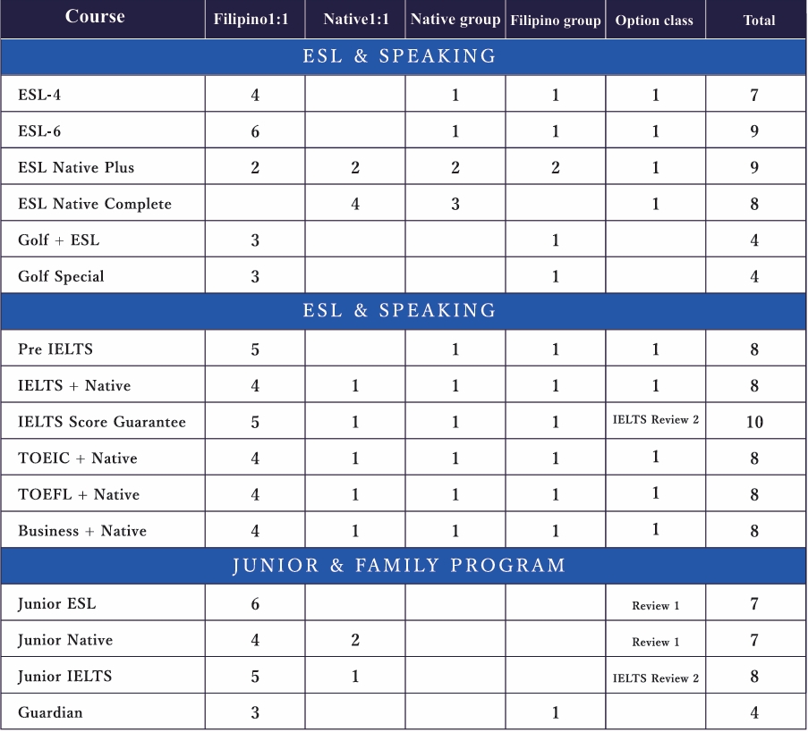 - Philippines 1:1 (6 giờ): Nhập vai, Giao tiếp cùng giáo viên , Nói thực tế hàng ngày, Báo cáo, Kỹ năng nghe, Đọc hiểu chuyên sâu, Vốn từ vựng, Viết ứng dụng cơ bản, Cấu trúc ngữ pháp và cách sử dụng, Cụm động từ và cách sử dụng