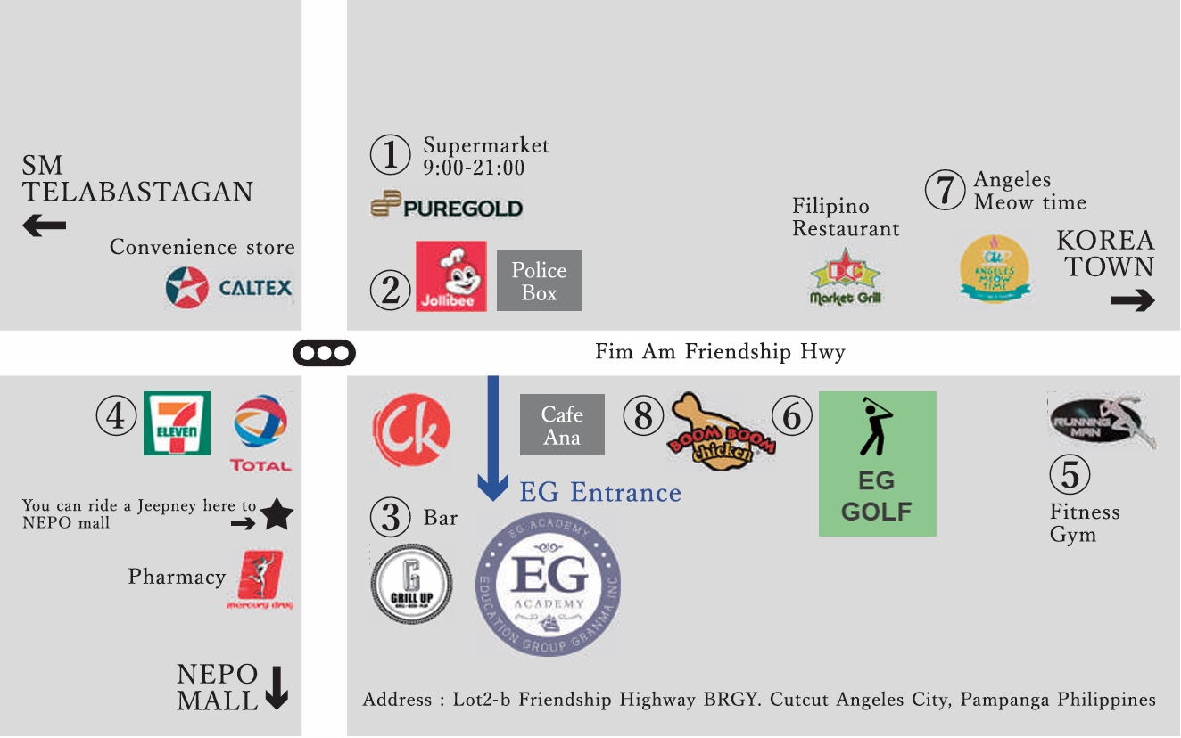 Học viện EG tọa lạc tại một khu vực tương đối an toàn, cách xa Khu kinh tế đặc biệt Clark và khu giải trí. Có rất nhiều siêu thị, cửa hàng tiện lợi và nhà hàng trong vòng 2 phút đi bộ ! Có ba phương tiện di chuyển chính: taxi, xe jeepney và xe ba bánh.