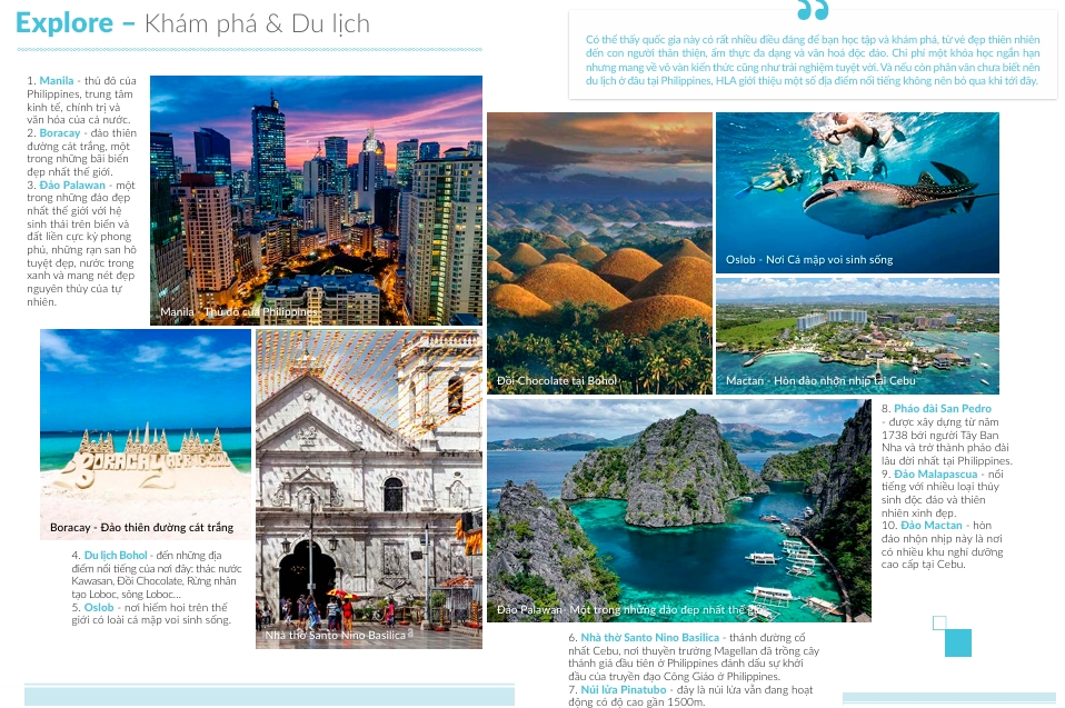 - Đây cũng là điểm đến yêu thích của du khách quốc tế với nhiều hòn đảo đẹp, người dân thân thiện và ẩm thực phong phú. Chính vì vậy các trường Anh ngữ tại Philippines trở thành địa chỉ học tiếng Anh hiệu quả và kết hợp du lịch nghỉ dưỡng cho học viên đến từ nhiều quốc gia Nhật Bản, Hàn Quốc, Trung Quốc, Đài Loan, Việt Nam, Thái Lan, Ả rập, Mông Cổ... Với nhiều năm kinh nghiệm làm trong trường Anh ngữ lớn tại Philippines và sự am hiểu trong lĩnh vực này, HLA ra đời với nguyện vọng xây dựng mô hình học tiếng Anh theo tiêu chuẩn quốc tế, có sự cải cách phù hợp hơn với người Việt và bạn bè quốc tế.