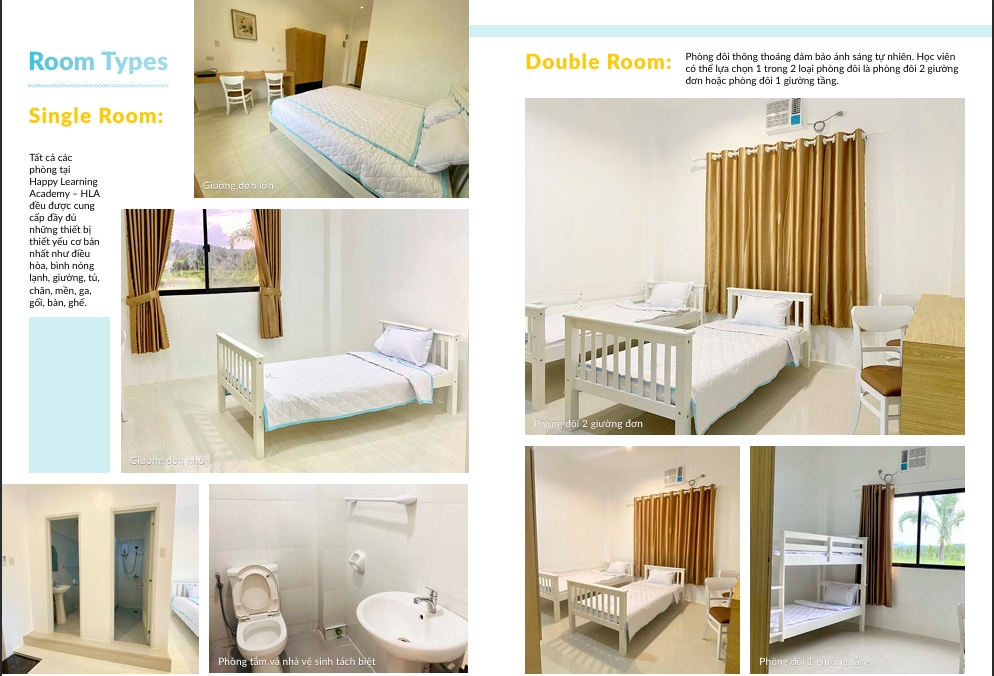 Happy Learning Academy có 88 phòng học dành riêng cho lớp 1 thầy 1 trò. Các lớp học luôn đầy đủ ánh sáng, thoải mái và thoáng mát. HLA là trường theo mô hình quốc tế, nằm ở khu vực ngoại ô của Cebu nên có thể tránh được sự phức tạp và ồn ào của trung tâm thành phố. Học tiếng Anh tại Happy Learning Academy học viên không chỉ hoàn thiện hơn tiếng Anh của bản thân mà còn là cơ hội được trải nghiệm những nét đẹp thiên nhiên, văn hóa và con người Philippines. Bạn bè đến từ nhiều quốc gia quy tụ về đây, cùng học tập và trao đổi văn hóa để rồi sau khi rời khỏi đây những gì bạn nhận được chắc chắn nhiều hơn một khóa học ngắn hạn có thể mang lại.