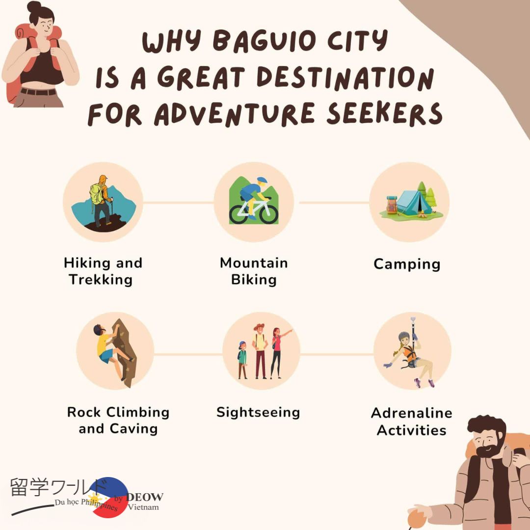Với khung cảnh thiên nhiên hùng vĩ, Baguio là nơi lý tưởng cho các hoạt động ngoài trời. Bạn có thể tham gia các tour đi bộ đường dài, leo núi, hay thậm chí thử sức với các môn thể thao mạo hiểm như zip-lining ở những khu vực gần đó. Những địa điểm như Mt. Pulag và Mt. Yangbew thu hút nhiều người yêu thích khám phá thiên nhiên.