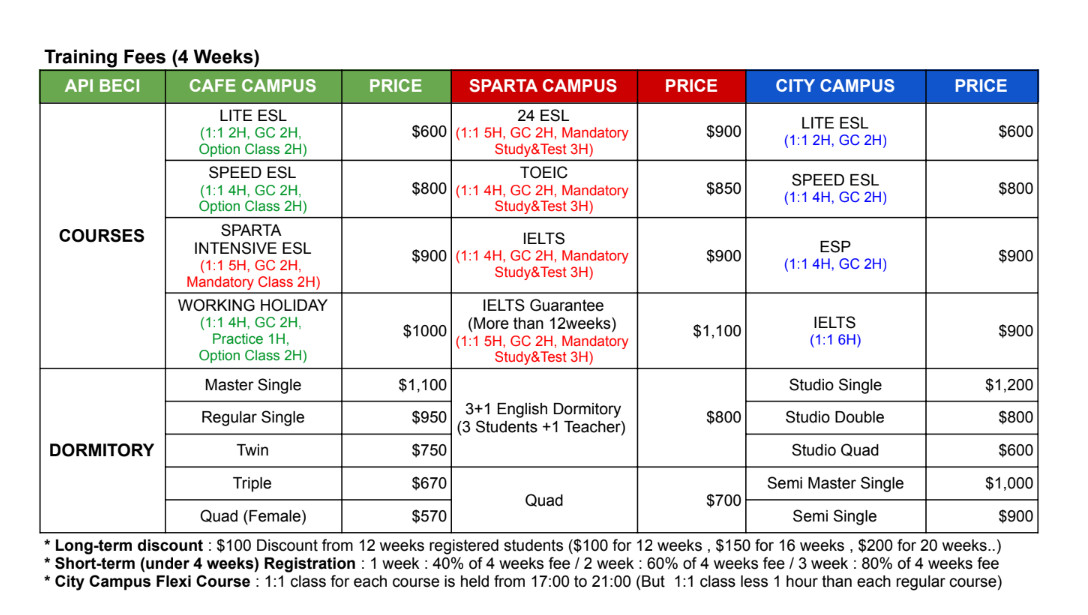 | Tài liệu học tập | Khóa ESL, Business: 1,000 peso/ 4 tuần Khóa IELTS, TOEIC: 1,500 peso/ 4 tuần |