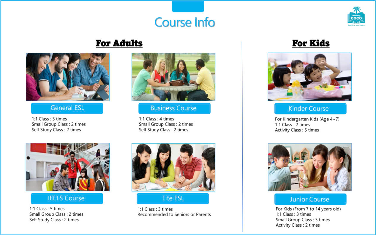 | Khoá học | General ESL, Lite ESL, IELTS, Business, Kinder, Junior |