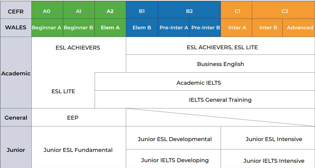IELTS: Đây là khoá học nhằm nâng cao điểm số trong bài thi IELTS dành cho những đối tượng có ý định học Đại học ở nước ngoài hay tìm kiếm việc làm ở nước ngoài. Qua khoá học này, học viên được học các kiến thức hiểu sâu về bài thi IELTS, vừa học được các kỹ thuật nhằm tăng điểm số. Khoá học thích hợp cho những ai lần đầu tiên học IELTS và muốn hiểu khái quát về kỳ thi IELTS. Học viên khoá học này không yêu cầu điều kiện đầu voà nhưng trình độ tiếng Anh nên ở mức tương đương TOEIC 550 hoặc IELTS 4.0 hoặc các đối tượng học viên từ khoá ESL chuyển lên khoá IELTS.
