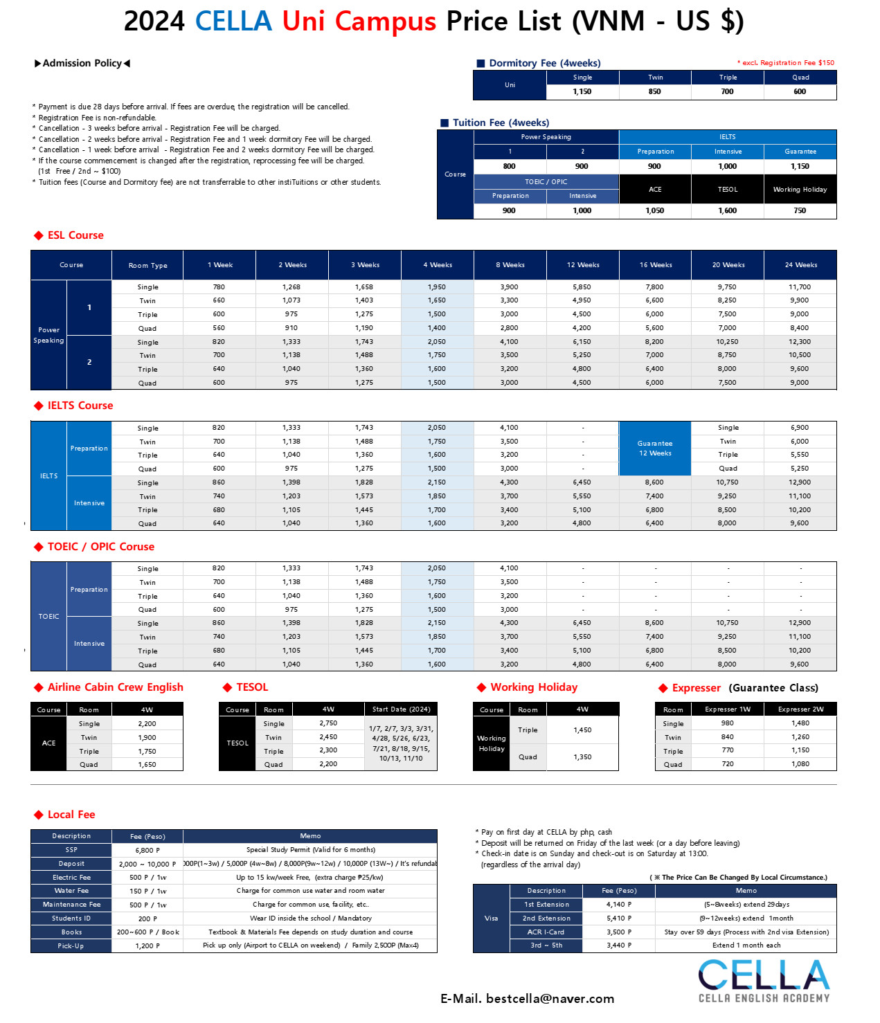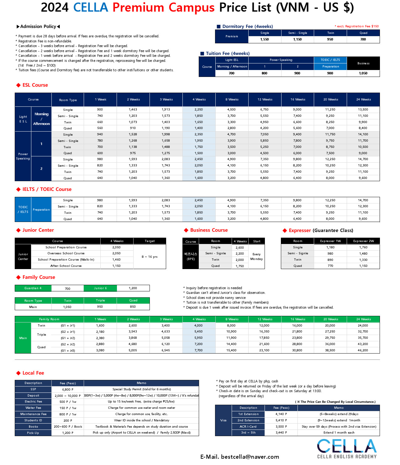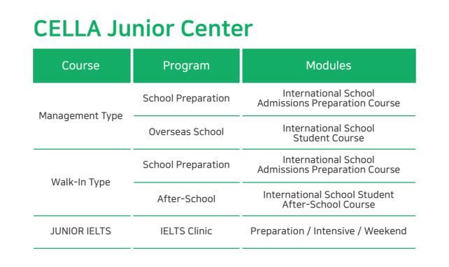 ESL, IELTS, TOEIC, ACE, TESOL, Expresser, Power Speaking, Business course, Family course. Đặc biệt, CELLA là trường anh ngữ duy nhất tại Philippines có khoá học Tiếng Anh Phỏng vấn dành cho Tiếp viên hàng không, ACE. CELLA là đối tác của ANC Học Viện đào tạo tiếp viên hàng không tại Hàn Quốc, phối hợp với trường CELLA thiết kế khoá học ACE để luyện tập cho kỳ phỏng vấn tiếp viên hàng không cho học sinh.