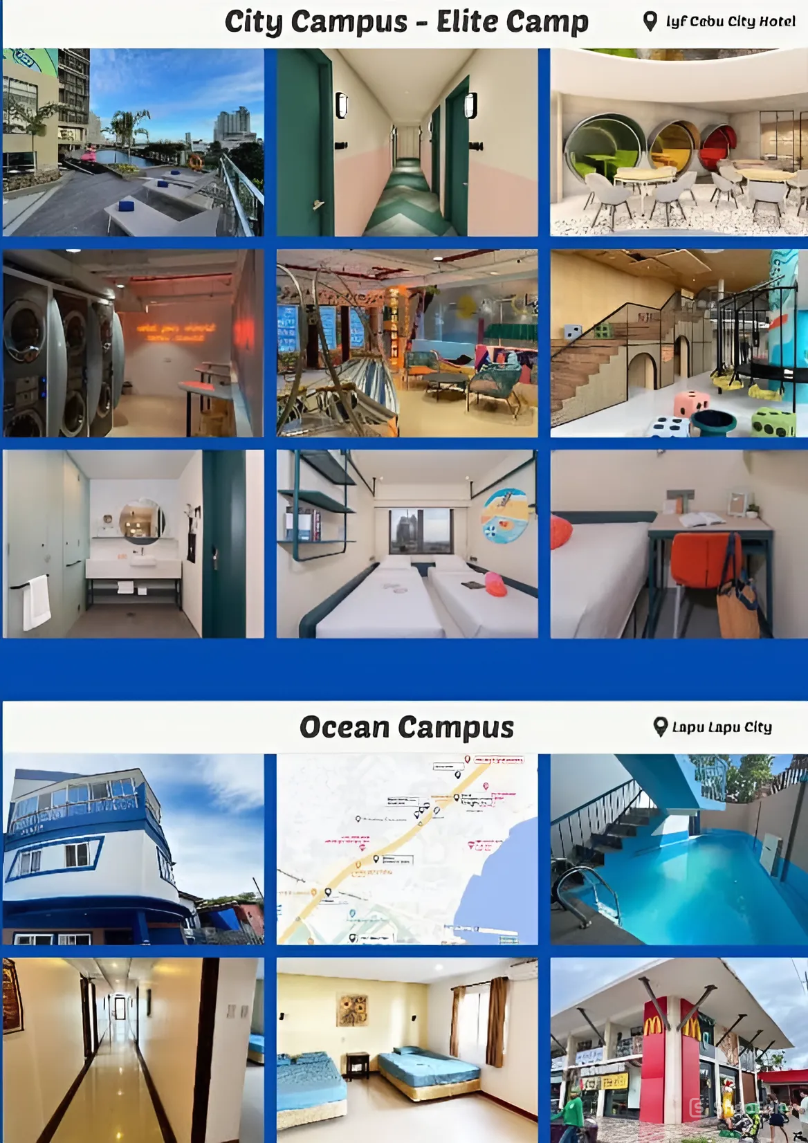 Khuôn viên này nằm ở đảo Mactan, một điểm đến nghỉ dưỡng nổi tiếng. Cách đó 3 phút đi bộ có các siêu thị, tiệm mát-xa và nhà hàng. Ocean Campus là một khuôn viên kiểu khu nghỉ dưỡng, hoàn hảo để thư giãn và học tập. Đây là nơi thích hợp nhất cho gia đình và trẻ em; để tận hưởng một kỳ nghỉ vui vẻ trong khi học tập nghiêm túc! Chính sách: EOP - chỉ sử dụng tiếng Anh trong toàn khuôn viên trường. Vị trí: Lapu-Lapu, Mactan Chứng nhận TESDA, SSP Sức chứa: 60 người Tiện nghi: Wifi, chỗ ở tiêu chuẩn khách sạn, Phòng tự học, Phòng ăn, Thư viện, Phòng y tế, An ninh 24/24 Chỗ ở: Maribago Arcade: 1 phút đi bộ (cách McDonald's, nhà hàng Hàn Quốc, cà phê, quán bar 100 m) |