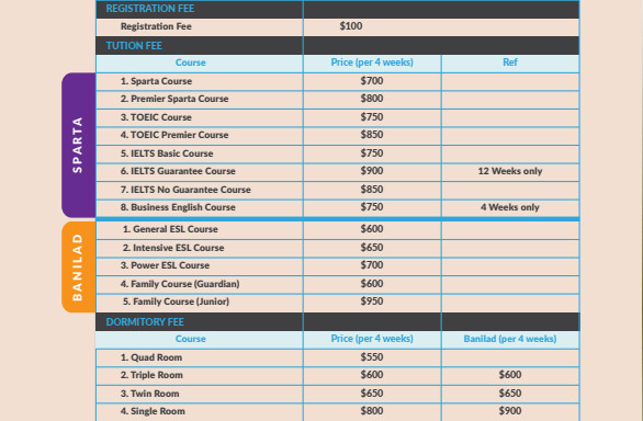 Chi phí cho 4 tuần: Lớp 1:1: ESL: 6,500 peso; Academic: 7,000 peso; Lớp nhóm: 3,000 peso |