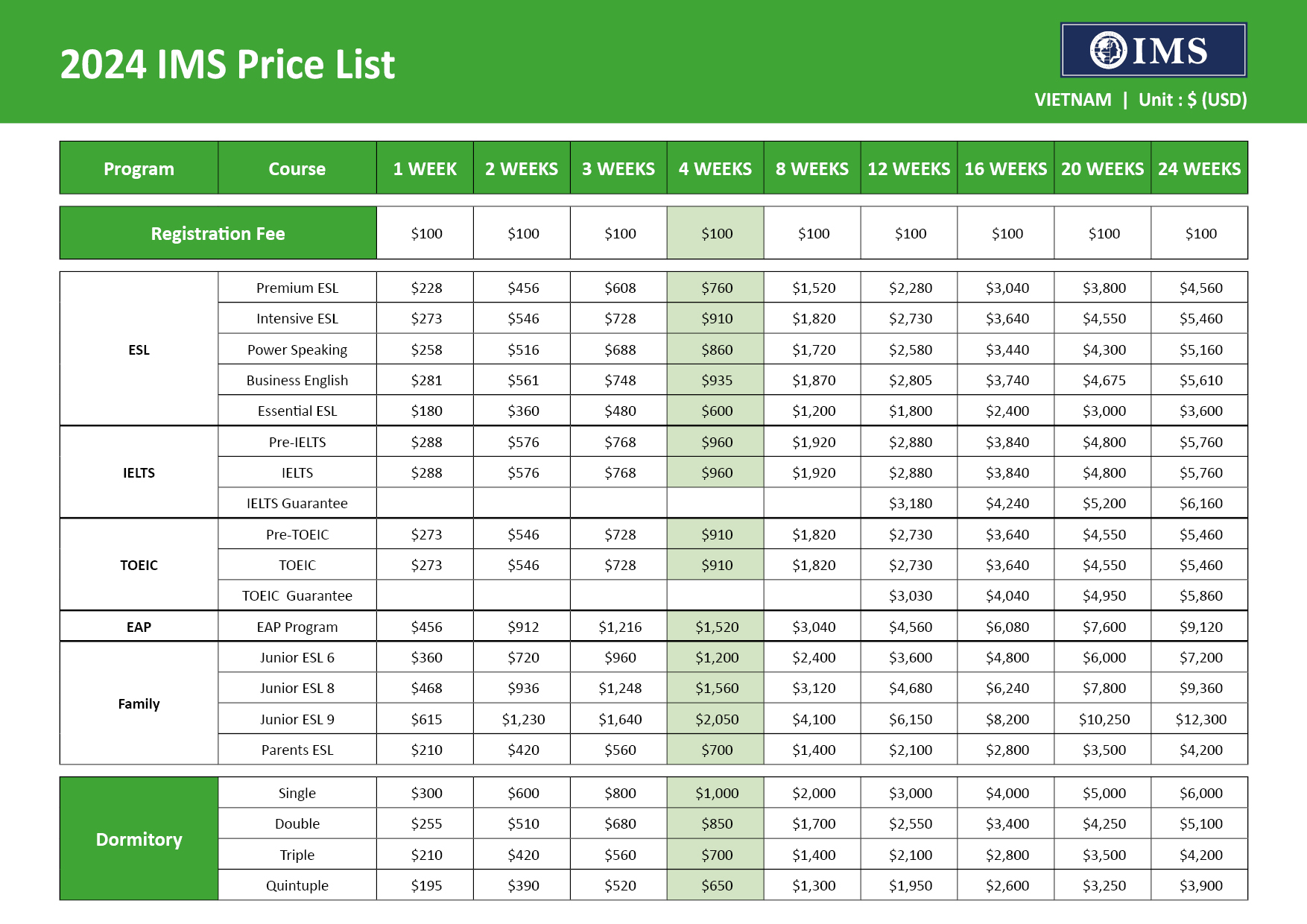 Bảng chi tiết học phí năm 2024 (áp dụng từ tháng 5/2024)