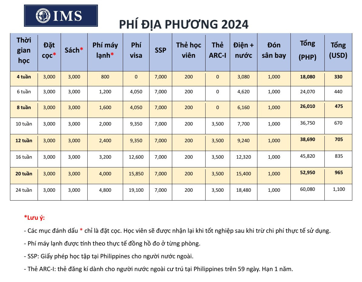 Chi phí địa phương (Đóng trực tiếp cho trường khi học viên đến nơi)