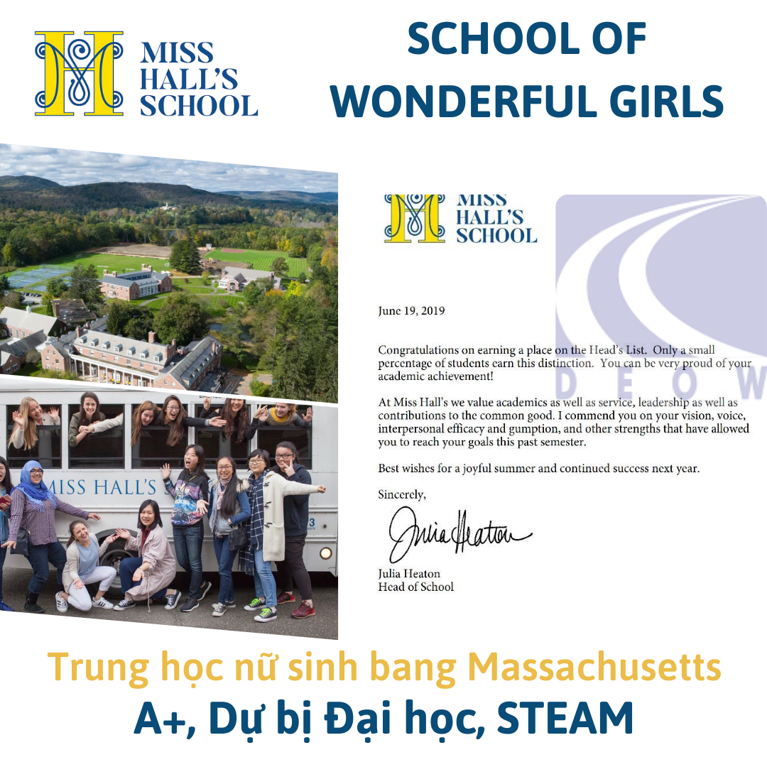 Trong hơn bốn thập kỷ giảng dạy và là trường có chất lượng giáo dục hàng đầu, tôi chưa bao giờ trải nghiệm một cảm giác truyền cảm hứng hơn bây giờ và cộng đồng gắn kết luôn có niềm tin 100% vào Sức mạnh của các cô gái. Tại Miss Hall’s School, Chúng tôi tin ở bạn!